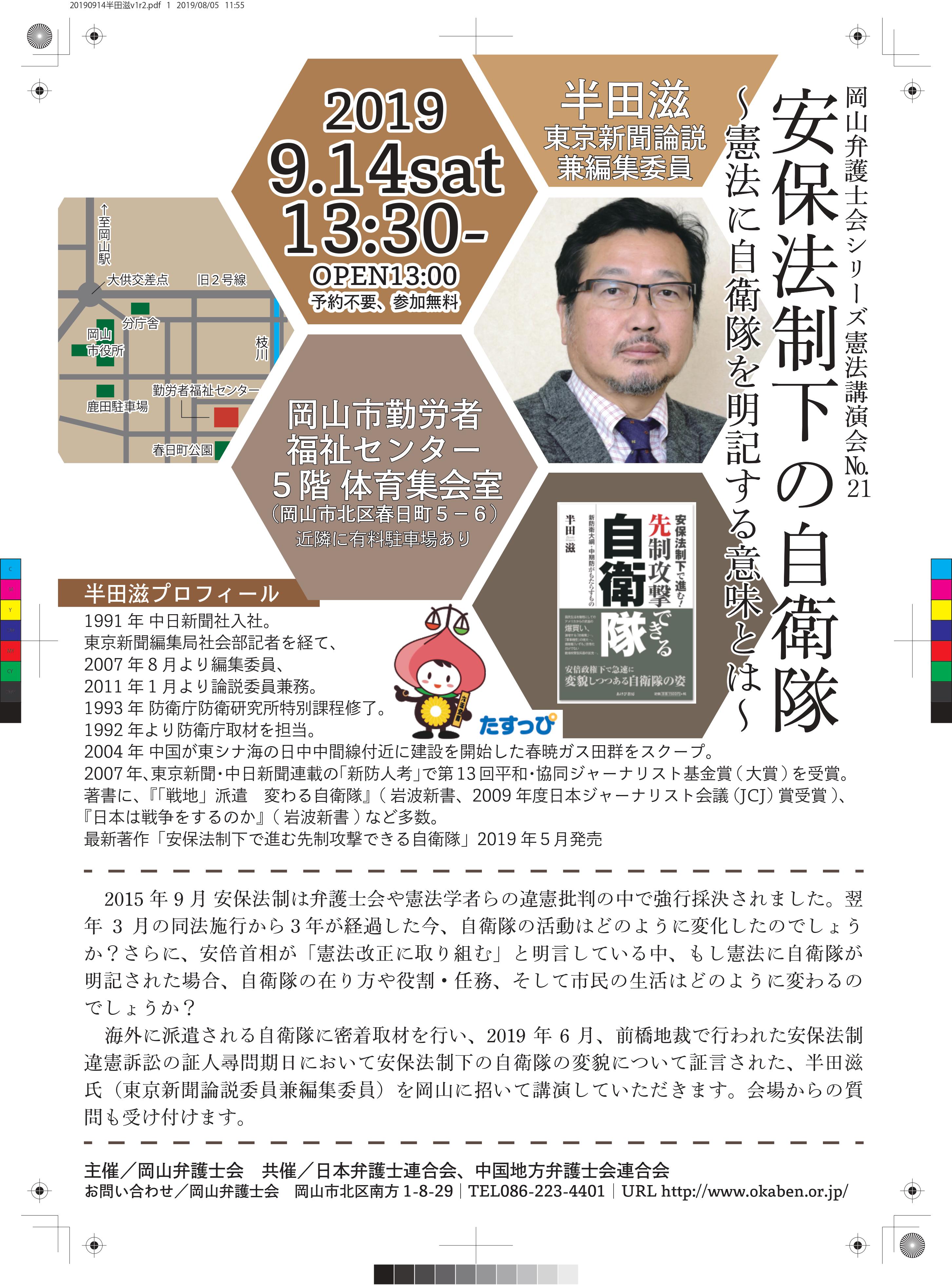 岡山弁護士会 > 新着情報 > イベント・相談会 > (2019.09.14)岡山弁護士会シリーズ憲法講演会No.21「安保法制下の自衛隊〜憲法に自衛隊を明記する意味とは〜」 > 安保法制下の自衛隊 チラシ